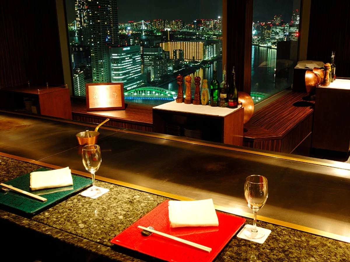 シェフの鉄板パフォーマンスと東京ベイサイドの景色を楽しめるお席