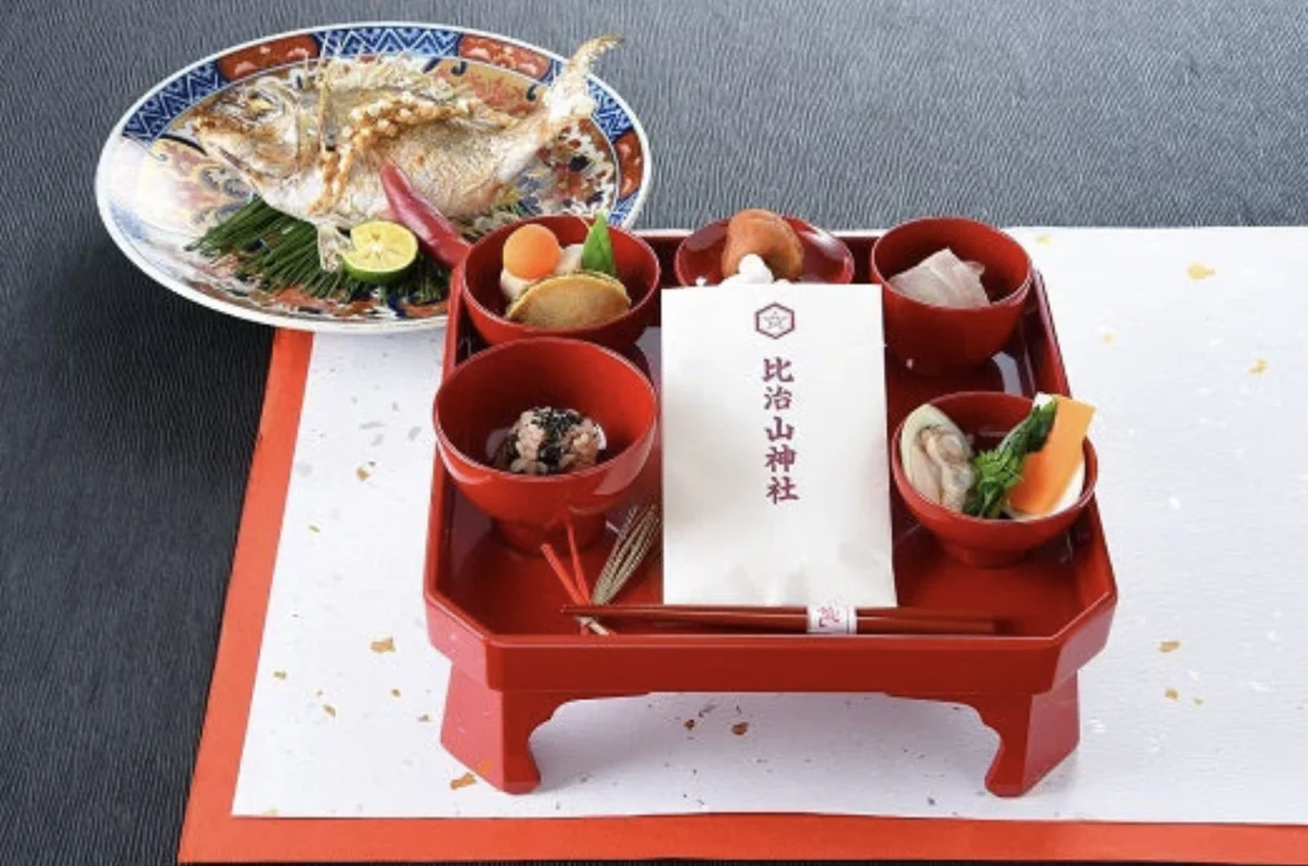 (料理、小鯛姿焼、名前入り記念箸、比治山神社御祈祷の歯固めの石付)