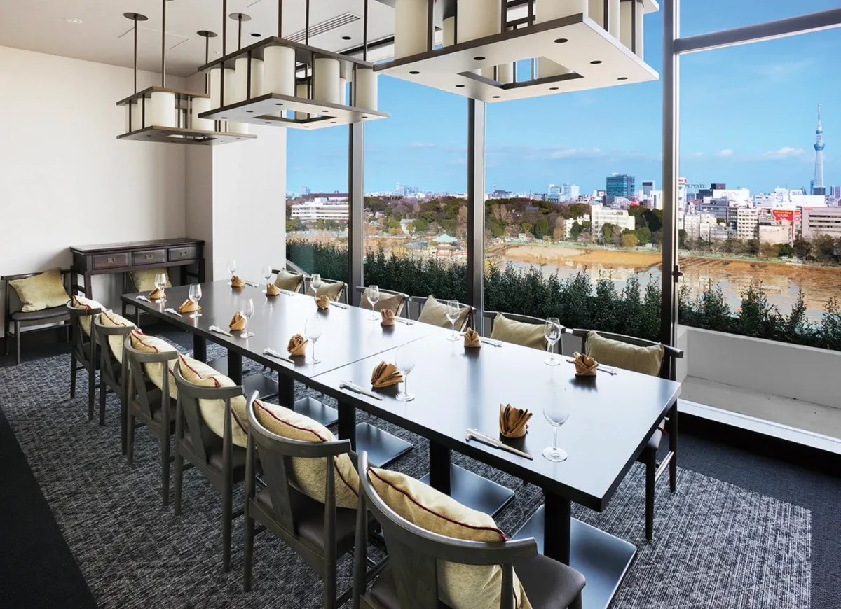 夜には、東京スカイツリーや都心の煌めく夜景が窓一面に広がり、まるで別世界にいるかのような幻想的な空間に。湯島・上野・御徒町からアクセスも良好で、接待やお顔合わせ、記念日といった大切なシーンに、格別のひとときをお届けします。