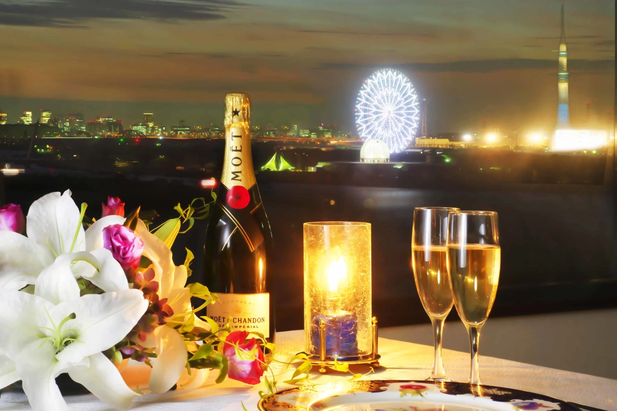 本プランでは、ベイエリアまたは舞浜エリアの眺望を望む窓側席をご用意しております。お天気に恵まれれば、どちらのお席からも大変美しい夜景をお楽しみいただけますのでご安心ください。