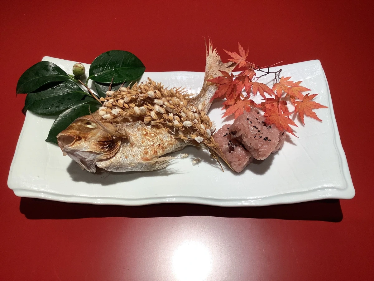 赤飯、汁、煮物、口取り、小鯛