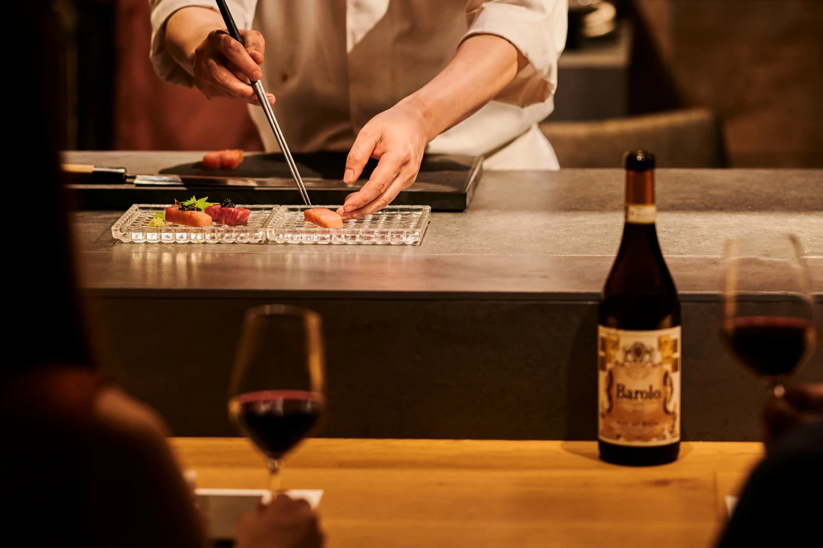 カウンター席では、職人の巧みな手仕事を間近に眺めながら、臨場感あふれる美食体験を。個室では、落ち着いた大人の雰囲気ただよう上質空間へご案内いたします。