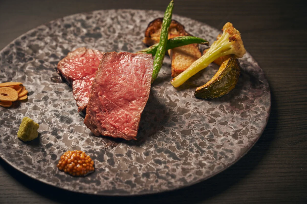 全国から厳選されたA5ランク和牛を使った炭火焼きは、和牛本来の旨味と甘みを引き出した一皿。シェフ特製の平打ちパスタを含む全10品のコースは、視覚と味覚を同時に楽しめる贅沢な構成です。