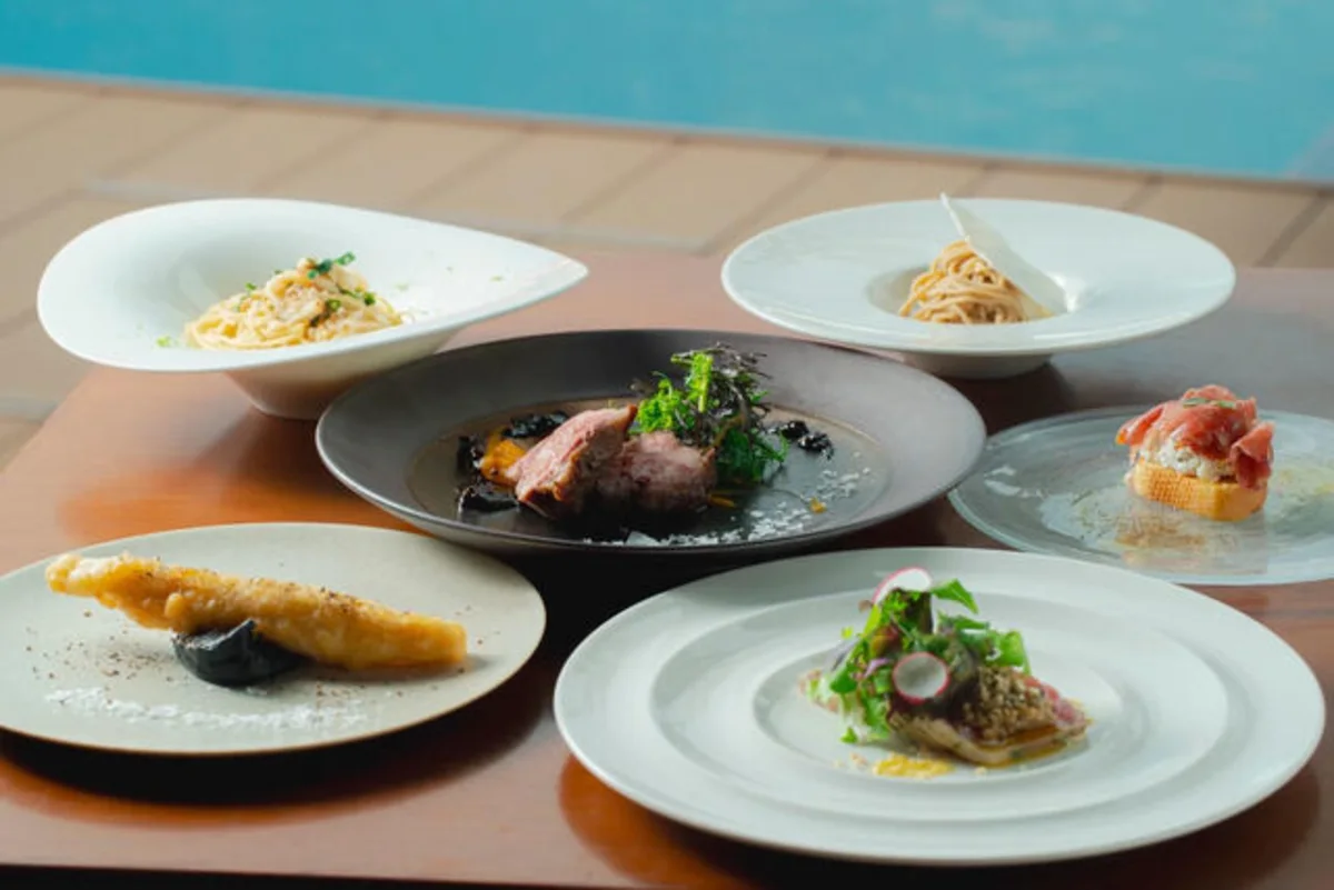 海と緑に囲まれた絶景ロケーションにある「The Lounge on the Water」。THE LUIGANS Spa & Resort内に位置し、リゾート感あふれるプールやパームツリーが広がるガーデンを眺めながら、旬の九州食材を使った本格イタリアンを堪能できます。デイタイムにはプールサイドから抜けるような海の青を楽しむことができ、ディナータイムには夕暮れから夜景へと変わる幻想的な景色が。エキゾチックな記念日や特別なひとときをお楽しみください。