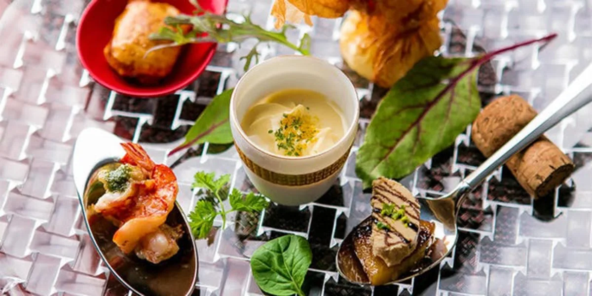 スパークリングワインで華やかに乾杯した後にご用意するのは、鮑にフォアグラ、更に特選黒毛和牛サーロインを含む豪華ディナーコースです。