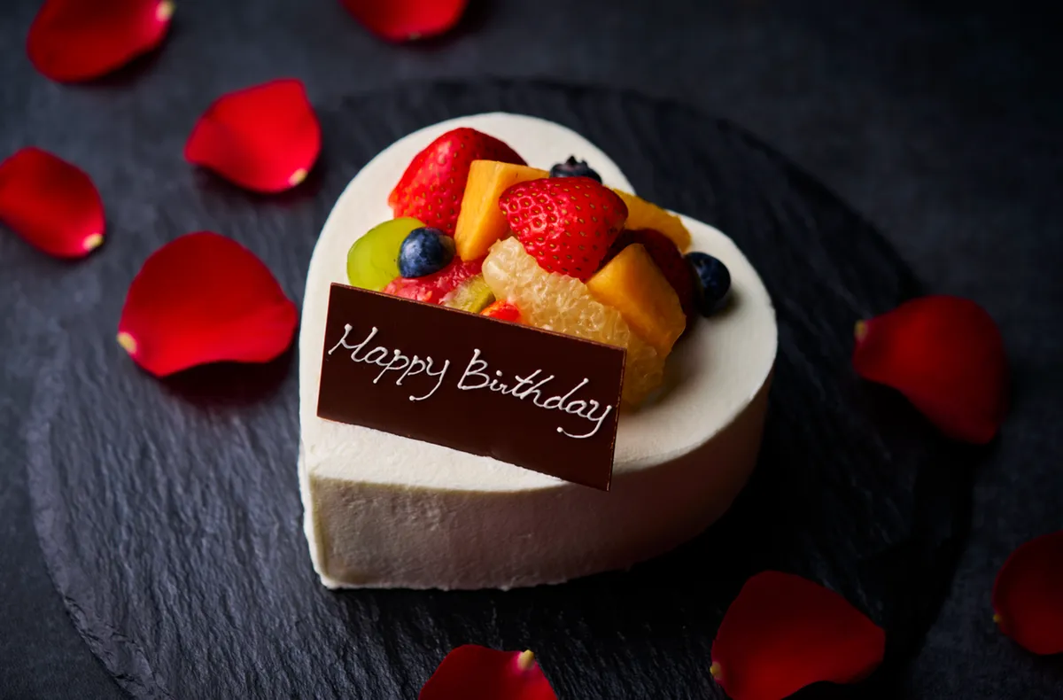 メッセージ付きハート型ケーキ&一輪のバラ