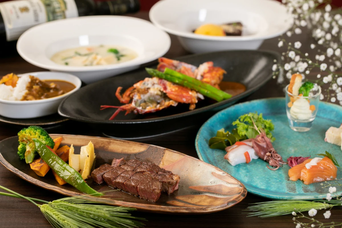 黒毛和牛のフィレとサーロイン、そしてカナダから直送された活オマール海老を鉄板で堪能できるコースは、特別な記念日にぴったりです。シェフが目の前で焼き上げるステーキは、肉汁があふれるジューシーな仕上がりで、噛むたびに旨味が広がります。オマール海老のプリプリとした食感と風味豊かな味わいも、忘れられない一皿となることでしょう。