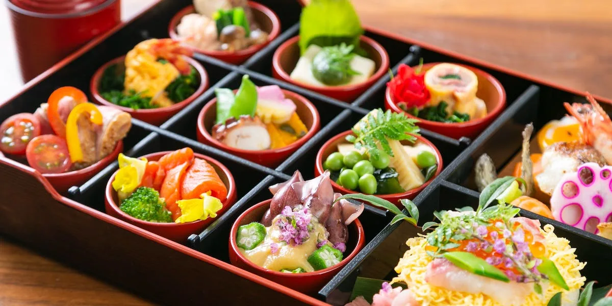彩り豊かな九個の小鉢と可愛い季節のごはんが入った福ご膳