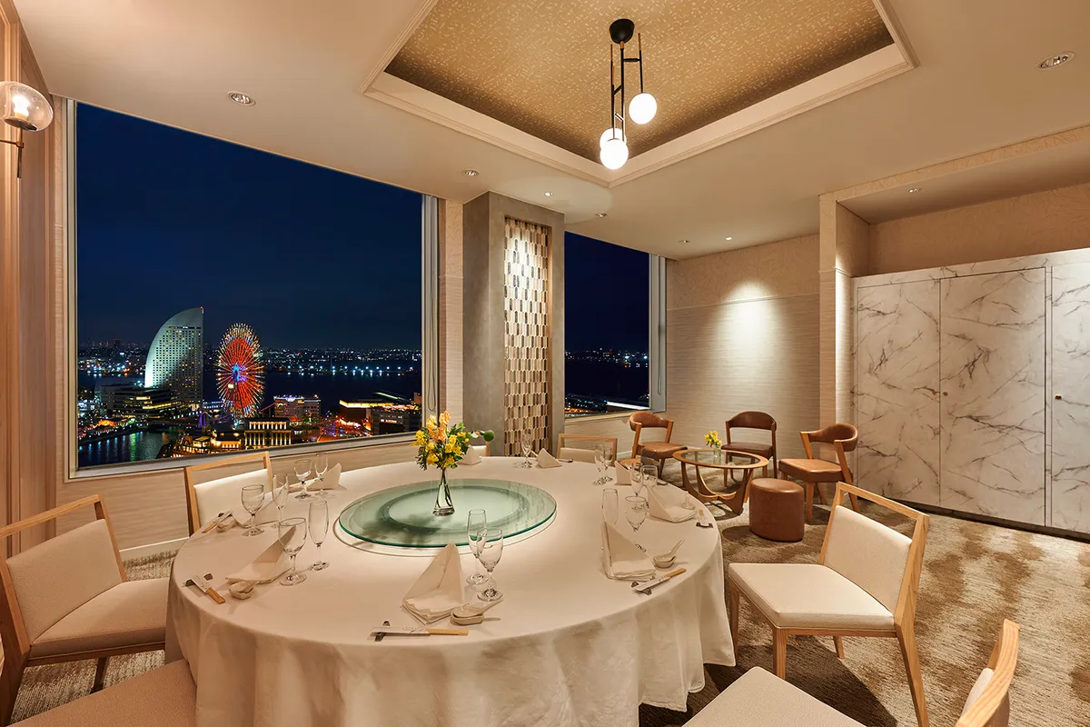 お席は、窓際の完全個室を確約。ランチタイムは爽やかで開放的な心地よさに包まれ、ディナータイムにはみなとみらいエリアの美しい夜景や大観覧車の光のショーなどをお楽しみいただけます。