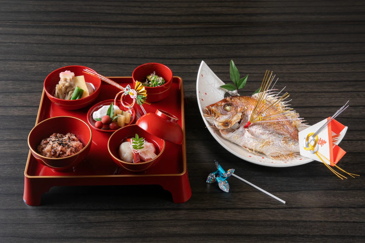 大人の方へご用意するのは、全8品の懐石コース「彩華」。季節ごとに変わる旬の食材をふんだんに使った全8品で構成されるお食事の数々をお楽しみいただけます。また、お食事が盛り付けられている有田焼にもこだわりがつまっており、細部にわたる配慮が、特別な日の食事をさらに華やかに彩ります。お子様へは、成長を願う特別なお食い初め膳をご提供いたします。