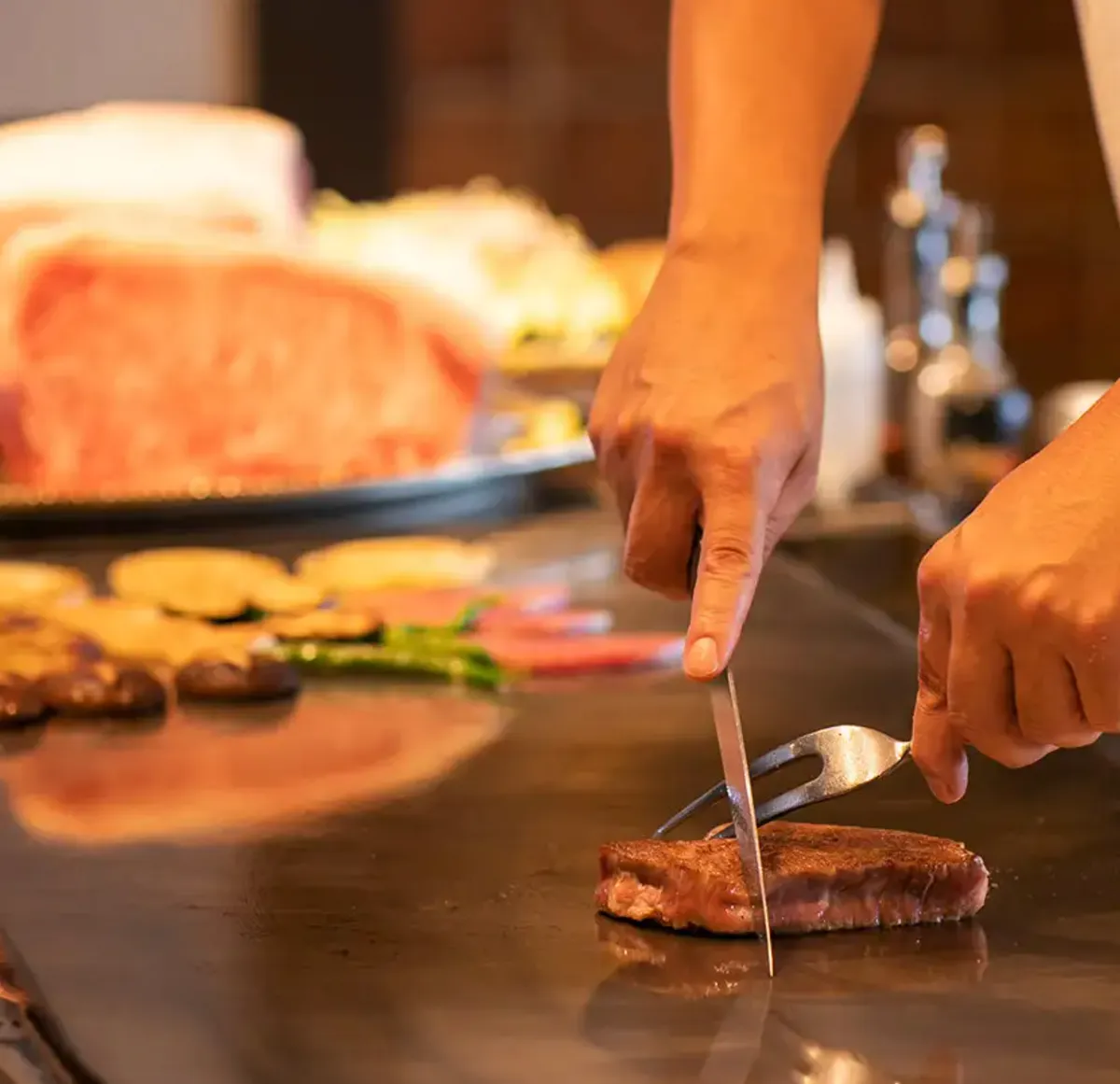 お召し上がりいただくのは、こだわりの国産牛など、厳選食材を鉄板焼きで楽しめる贅沢なコース。大切な節目の日にふさわしい内容でご提供いたします。