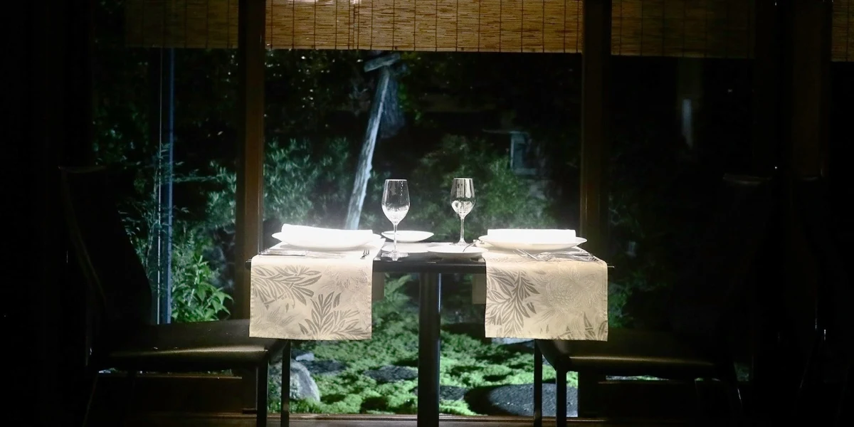 店内は銀閣寺をモチーフにした「黒と白」の美しいコントラストで彩られ、窓の外には四季折々の自然が楽しめる日本庭園。落ち着いた雰囲気の中、ゆったりとしたテーブル席へご案内いたします。静かで上品な空間は、大切な想いを伝えるプロポーズにぴったりの舞台です。