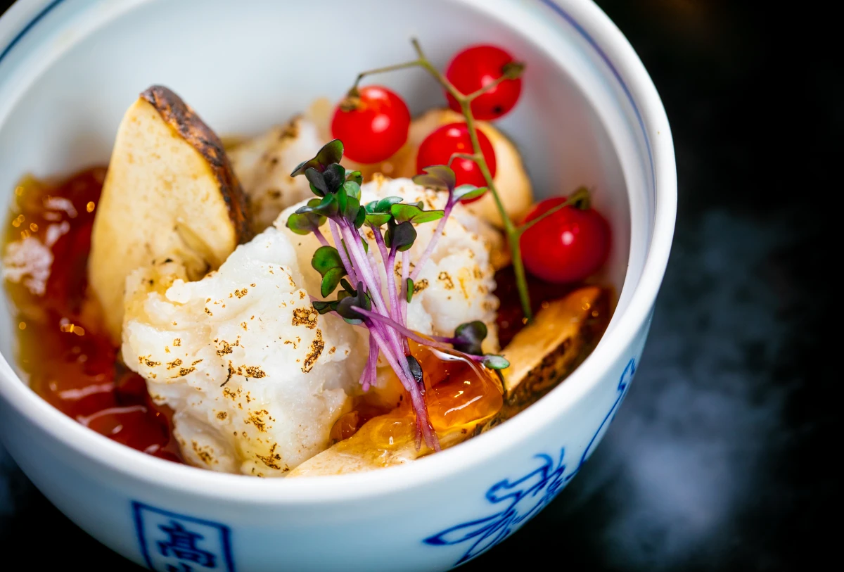 店内は黒を基調とした落ち着いた雰囲気で大人の隠れ家として親しまれている「和食フレンチと日本酒専門店 TABI」。日本酒との相性を考えてシェフが考案したオリジナルの和フレンチをお楽しみいただけます。