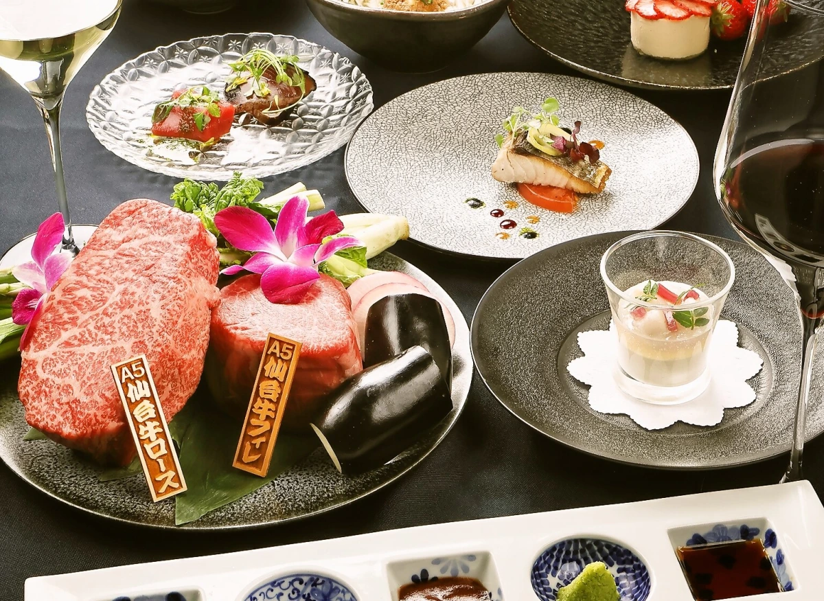 お料理は、A5仙台牛の贅沢な味わいと旬の食材をふんだんに活かした特別なコースをご用意。全3種類の豪華コースからお好みに合わせてお選びいただけます。A5仙台牛ロース・フィレの食べ比べをはじめ、旬の魚介や洗練された料理が絶妙に組み合わさり、特別な一日を華やかに演出します。