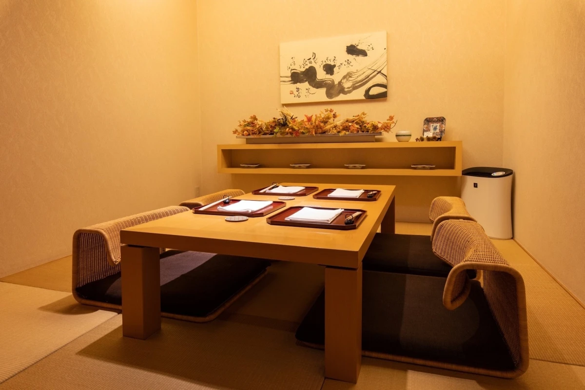格式高い玄関を抜け店内へ入ると、そこには趣のある和空間が広がります。インテリアや照明、食器など全てに手を抜くことなく表現される空間で、とっておきの料理をご堪能ください。お二人で落ち着いて話せる時間が素敵な思い出を彩ります。
