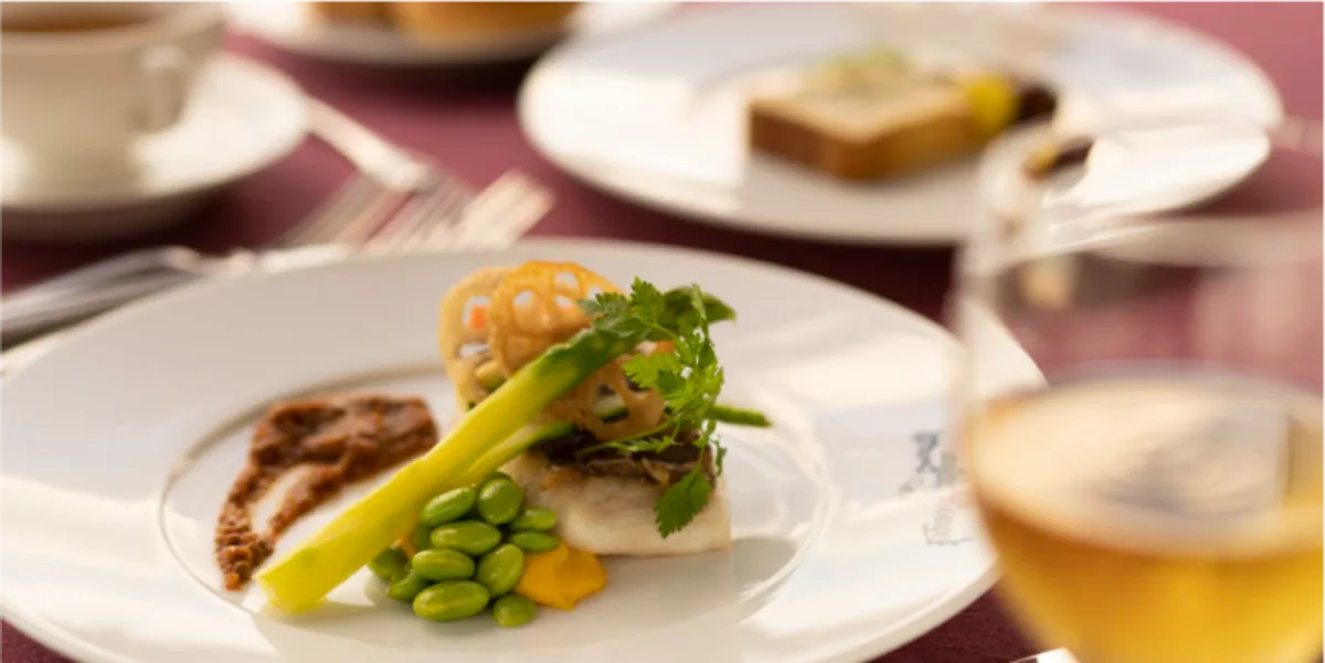 新鮮な海の幸や牛フィレ肉などをご堪能いただけるコース料理は、お味はもちろん、見た目の美しさにもこだわっております。大きな窓から移ろう景色をお楽しみいただけるお席で、シェフ渾身のフレンチをご賞味ください。