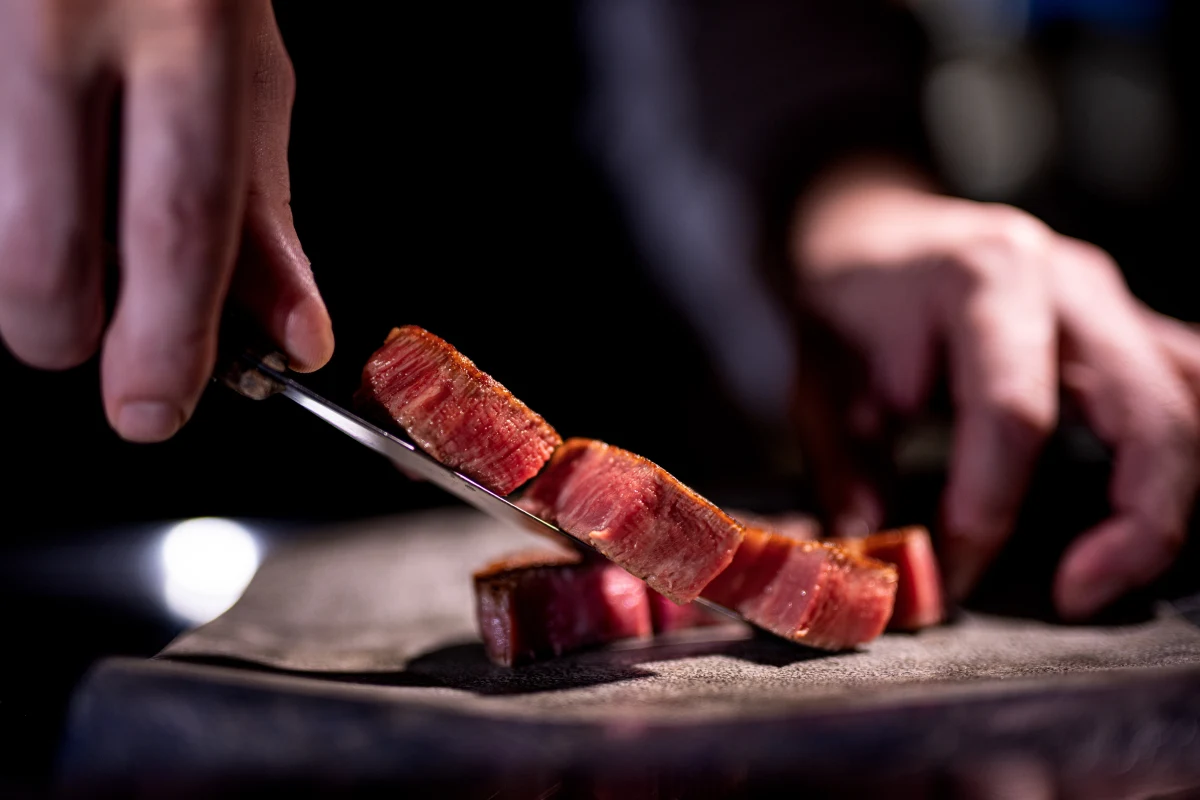 黒を基調としたお洒落な店内で、誕生日や記念日、プロポーズなど、大切なひとときを過ごせます。高級感漂う空間に、目の前で極上料理が味わえるカウンター席と特別感あふれる個室をご用意。お料理はこだわりの厳選食材を贅沢に使用しています。メインのお肉を、鉄板焼きかグリルかを選べるのも魅力です。