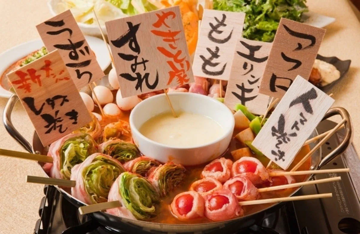 「博多串焼き ここにこんね」では、ヘルシーな野菜を使った野菜巻き串や、濃厚なもつ鍋を始めとした種類豊富なメニューを取り揃えています。