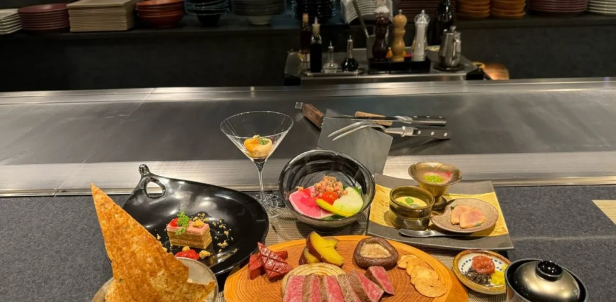 お料理は、九州直送の黒毛和牛や、毎朝市場から仕入れる新鮮な海鮮を使用した鉄板焼きコース。一皿ごとに繊細な技が施され、素材の旨みを最大限に引き出した逸品が並びます。和やかで特別なひとときをお過ごしください。