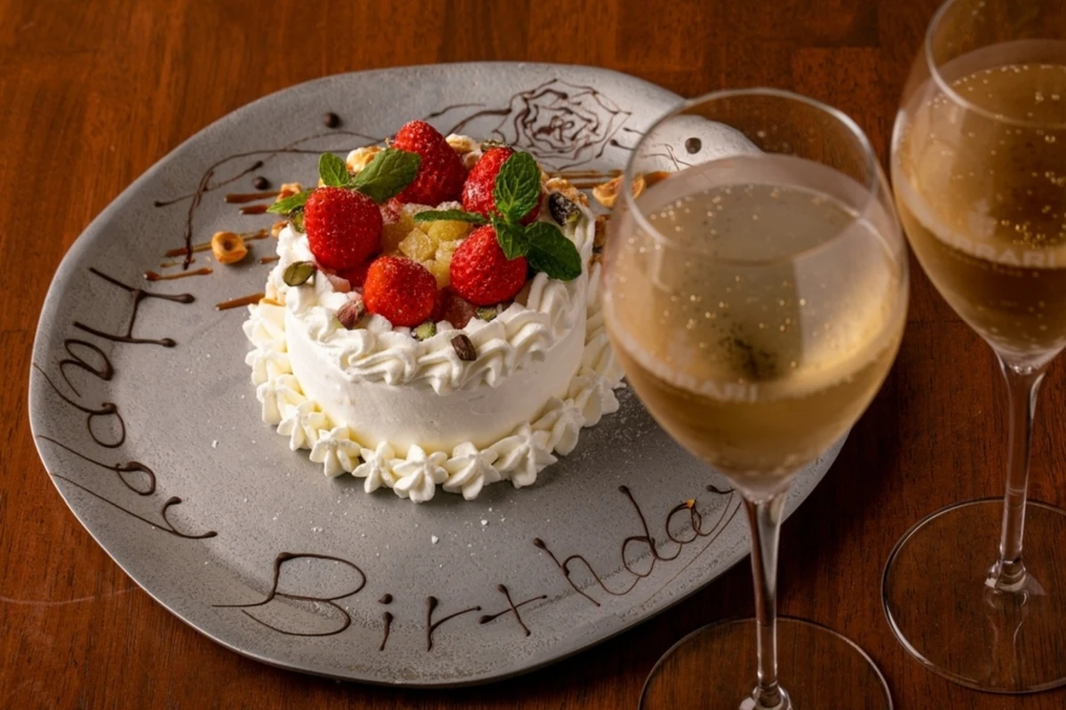 - ※メニューは仕入状況等により変更となる場合がございます。予めご了承ください。※料理、席、特典等の写真はイメージです。※ 当日のご予約はホールケーキではなくデザート盛り合わせになります。