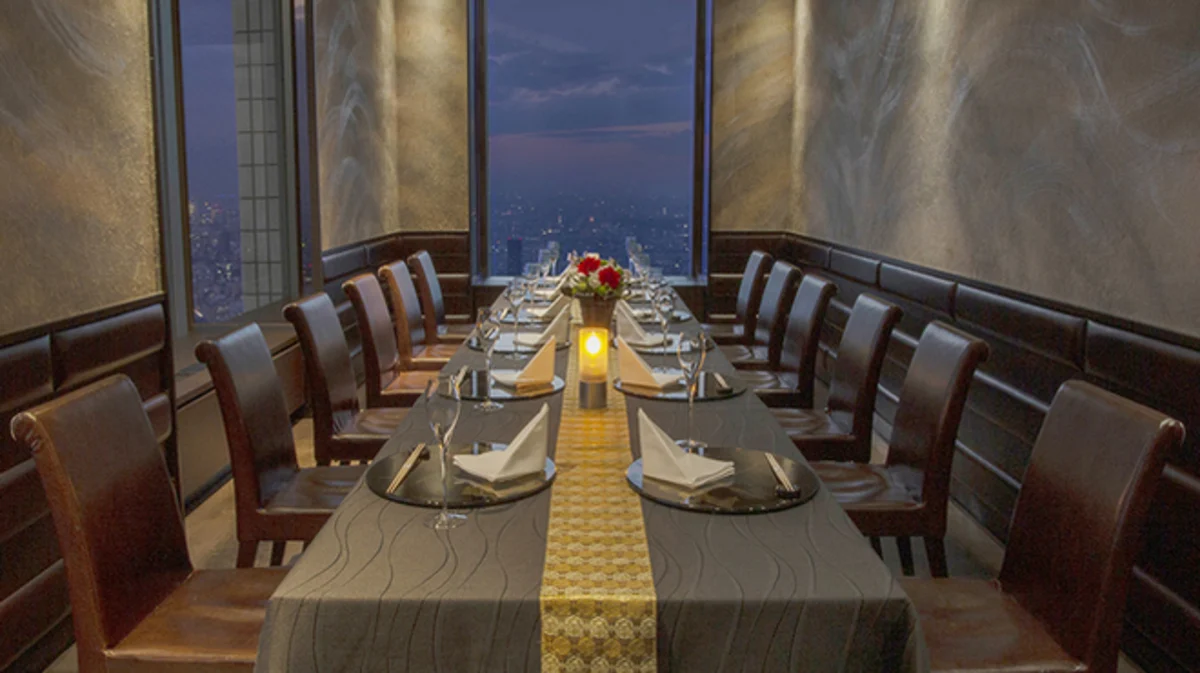 最大60名様までご利用いただける大人数のお集りに最適な、地上220mからの圧巻の景色と厳選食材で織りなす絶品懐石が魅力的な日本料理店「天空の庭 星のなる木」。