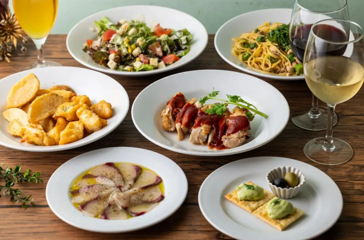 ディナータイムには、ボリュームたっぷりのコース料理全7品と2時間の飲み放題が付いたプランを提供。一品一品丁寧に仕上げられた料理がずらり。さらに、ドリンクメニューには100種類以上のバラエティ豊かなフリードリンクが揃っており、ビールやワイン、カクテルまで幅広く楽しめます。