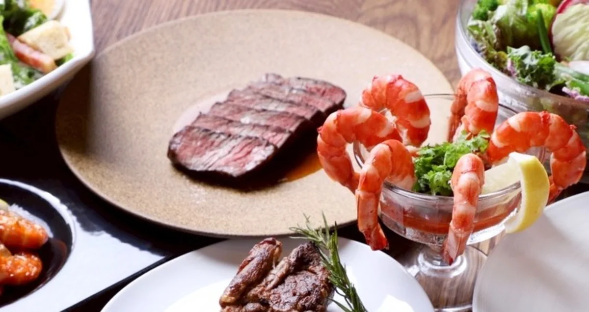 お食事には、選び抜かれた旬の食材を生かしたグリルスタイルの料理をご用意。ジャンボシュリンプカクテルや和牛ステーキ、チーズたっぷりのガーリックトーストなど、贅沢なディナーを堪能できます。魚介料理を加えたコースもあり、前菜からデザートまで味わいの重なりが印象的なひとときを演出します。