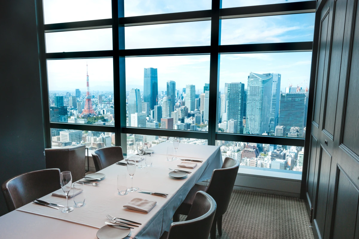エントランスを抜けると、まばゆい光に包まれた東京の絶景が皆さまをお出迎えいたします。ランチでは降り注ぐ太陽が、ディナーでは宝石のように輝く夜景が皆さまの輝かしい門出をお祝いしてくれます。陽の光とともに移り行く景色は息をのむ美しさです。東京タワー、東京スカイツリーと異なる東京のシンボルと共に、数々の門出をサポートしてきたスタッフが皆様のご来店を心よりお待ちしております。