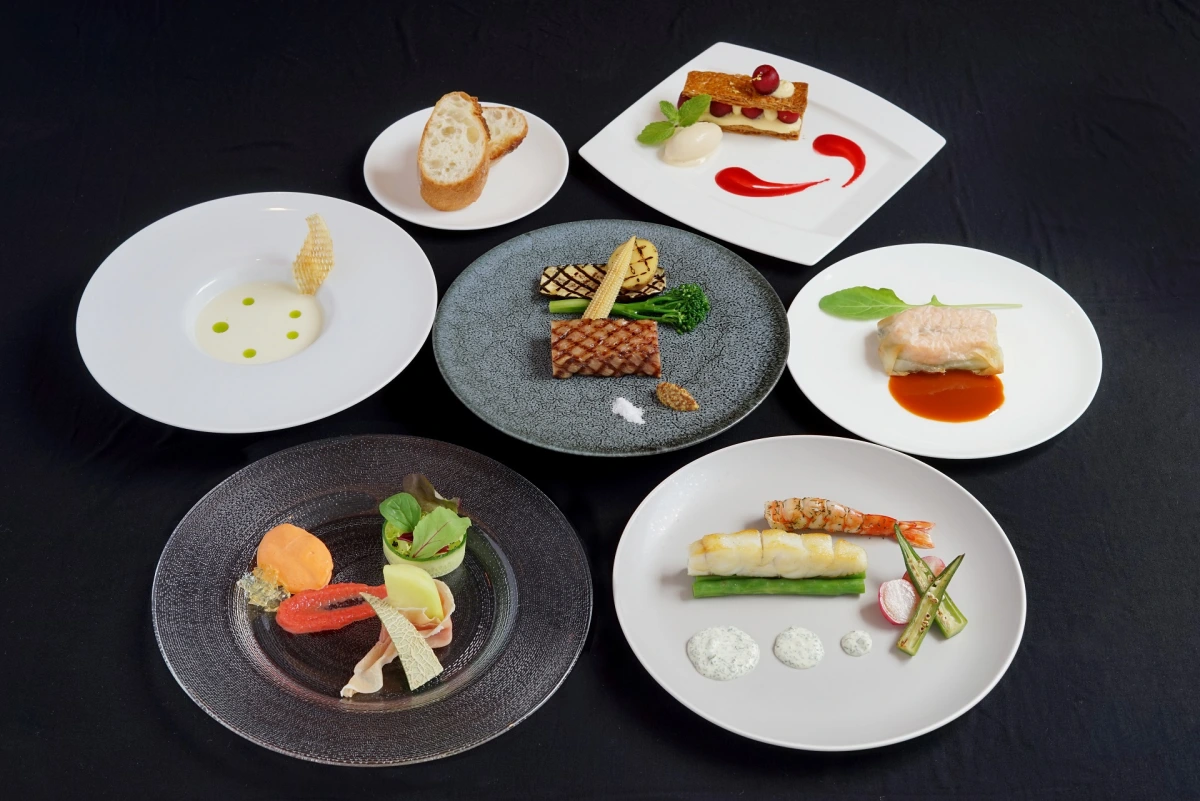 お食事は全7品のフレンチフルコース。旬の味覚をふんだんに使用したフランス料理をご堪能ください。メッセージ付きのデザートプレートもご用意しているので、サプライズ演出も可能です。