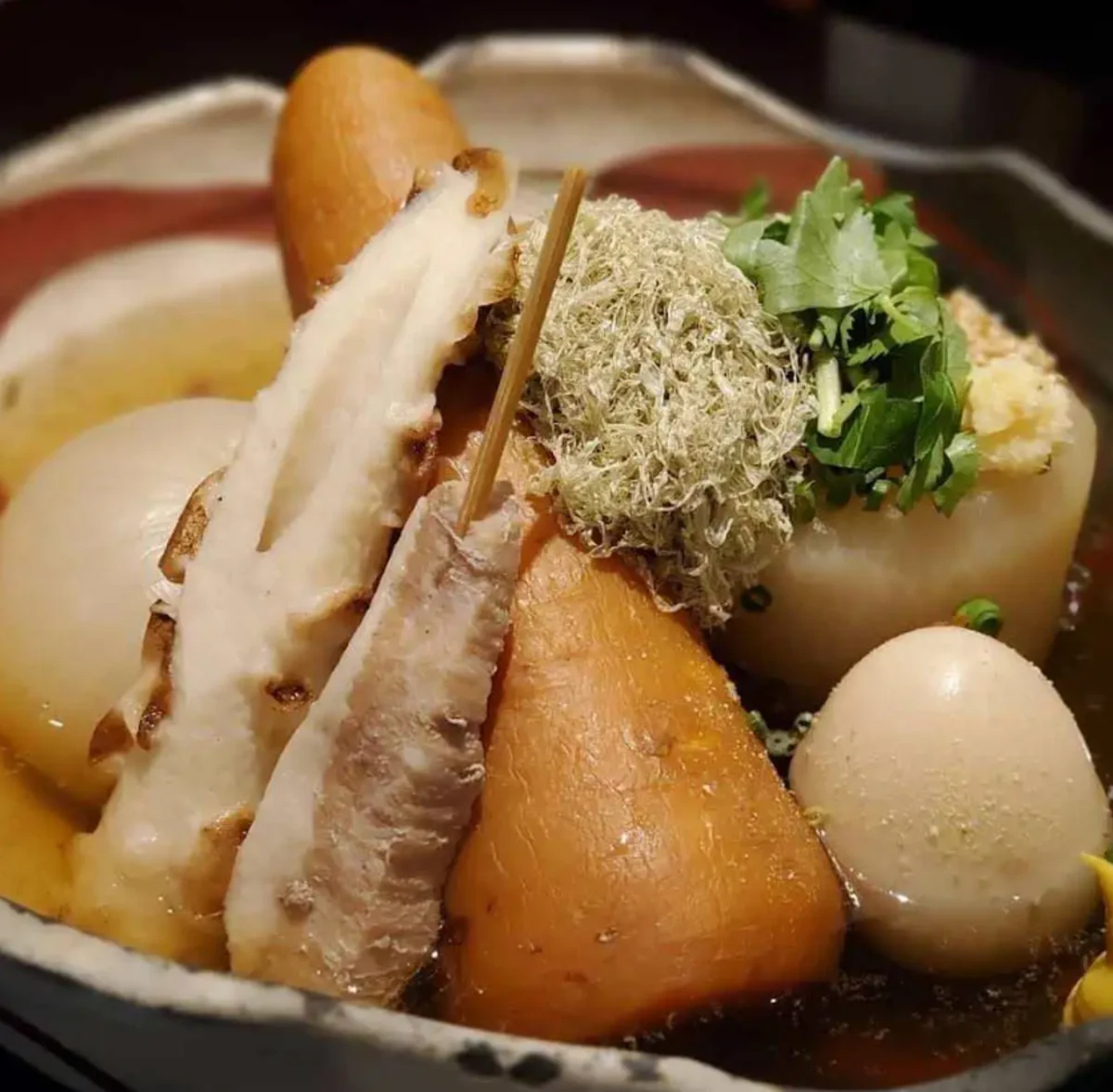 「四季を楽しむおまかせコース」は、新鮮な地元の野菜や旬の食材を使用し、熟練の職人が丁寧に仕上げた一品一品が、食材本来の旨味を引き出しています。特に自慢のおでんは、静岡県御前崎産の特選花鰹節でとった琥珀色のお出汁で炊き上げられ、優しい味わいが広がります。地酒やワインとともに、贅沢な味わいを堪能できます。