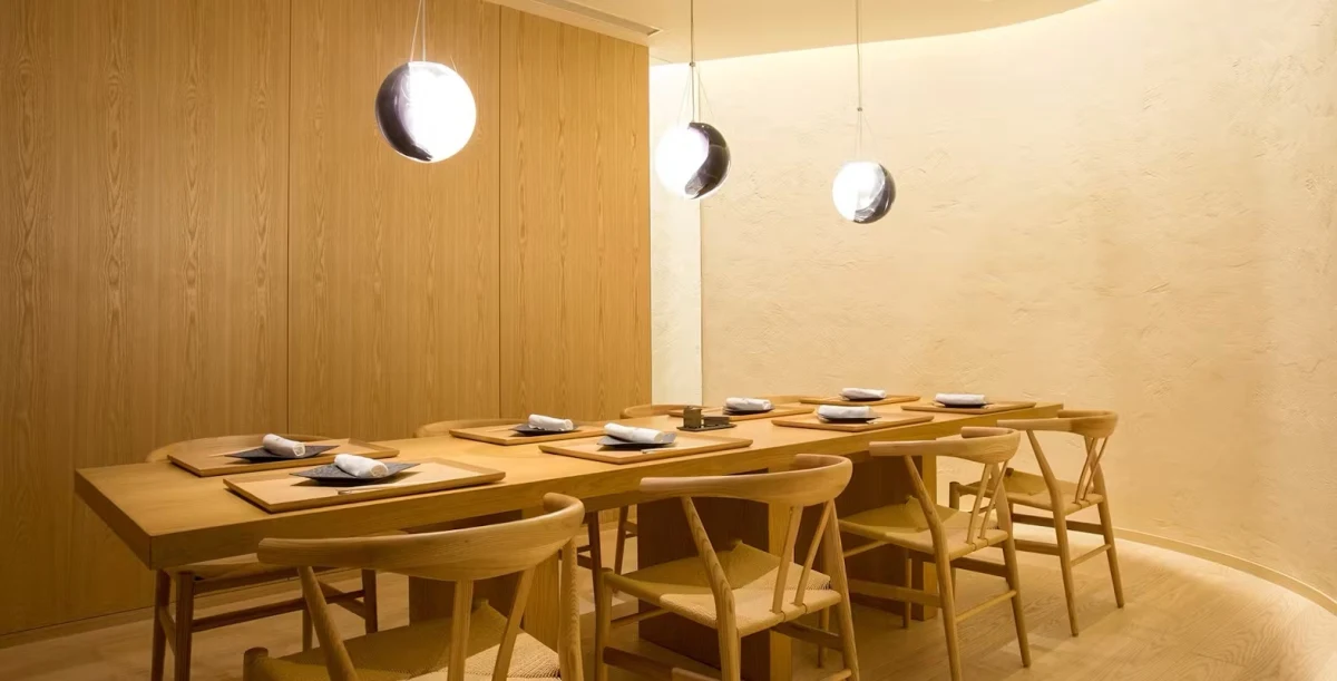 木の温もりを感じられる、美しい設えが印象的な店内には、白と黒の対比が斬新な寿司カウンターと、大小3つの鉄板焼きカウンター、そして趣の異なる7つの個室とセミプライベートルームを完備。異なる魅力を持つ洗練空間が、特別なひとときに寄り添います。