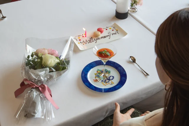 デザートには、ご希望のメッセージをプレートに描いた特製ケーキをご用意。心ときめく演出で、お相手に感動と笑顔を届けます。プロポーズの感動的なひとときを、このケーキが一層華やかに盛り上げることでしょう。