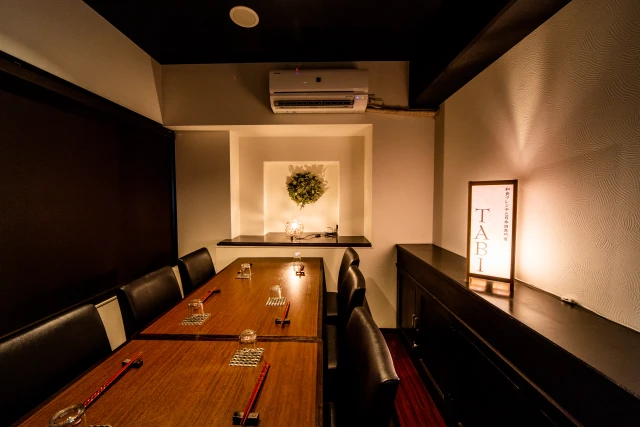 店内は黒を基調とした落ち着いた雰囲気で大人の隠れ家として親しまれている「和食フレンチと日本酒専門店 TABI」。日本酒との相性を考えてシェフが考案したオリジナルの和フレンチをお楽しみいただけます。 日本酒は月替わりで全国から集めたおすすめを約40種ご用意しております。その日の一番良い食材を使ったお料理の数々と、厳選された日本酒でマリアージュをお楽しみください。 季節が変わるごとに訪れたくなる大人の隠れ家で素敵なひとときをお過ごしください。