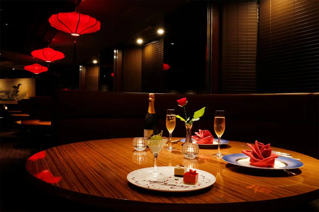 【アニバーサリープラン】鮑のステーキやフカヒレ姿入り蒸スープ、ロブスターなど本格四川料理を味わう豪華中華コース全8品「極光」+メッセージ付きデザートプレート+お花のプレゼント★ローズホテル横浜内レストラン★アニバーサリー仕様にセッティングされたお席へご案内★