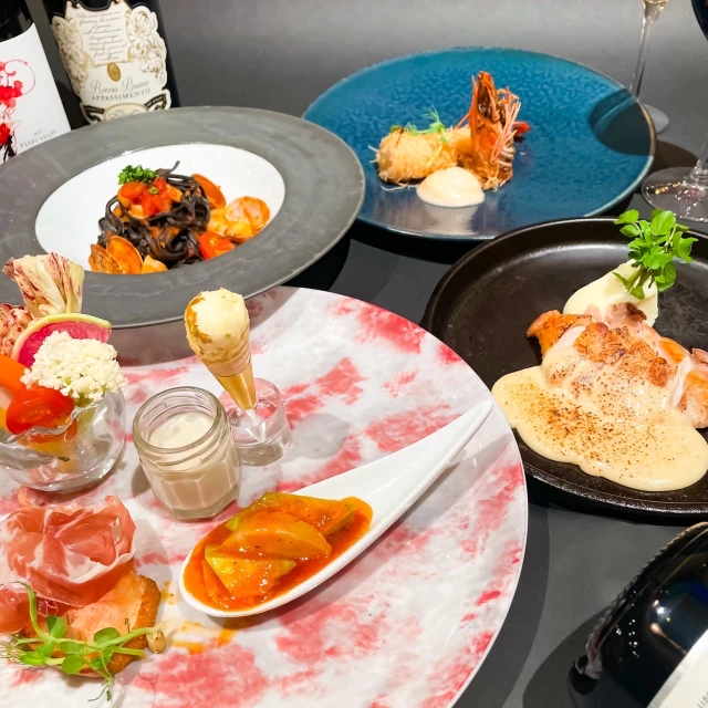 彩り鮮やかなイタリア料理はもちろん、独創的な「ウェルカムバブルカクテル」やスタッフが目の前で描き上げる「テーブルアートデザート」が大人気、記念日やお誕生日などの特別な一日にも最適です。