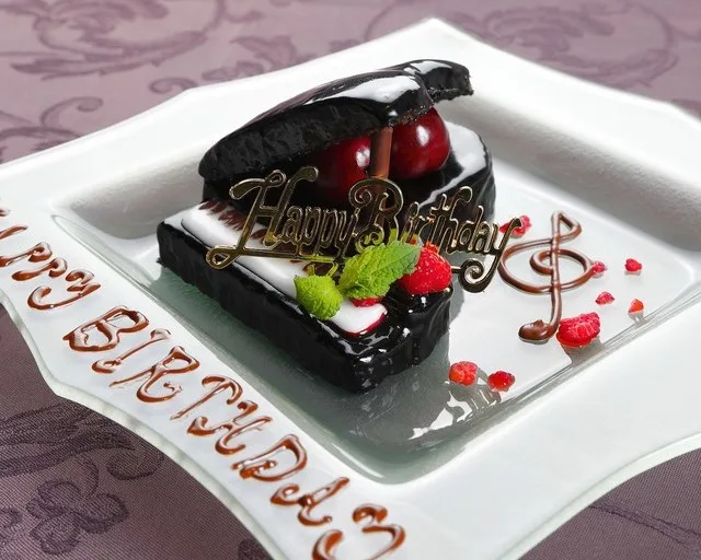 ガーデニア特製のピアノ型チョコレートケーキに愛のメッセージを添えて
