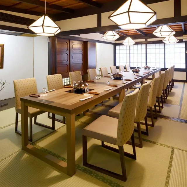 浜松市中央区に位置するグランドホテル浜松別館の「民芸割烹 いなんば」は、伝統的な民芸調の建物で、旬の食材を活かした日本料理や秘伝のゴマダレで味わうしゃぶしゃぶ、お客様の目の前でお好みのまま焼き上げる豪華鉄板焼きステーキなどを提供するレストランです。