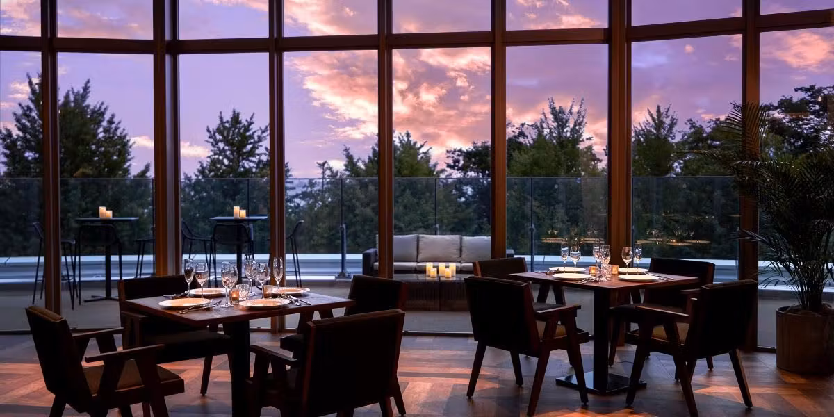 店内は、落ち着いたモダンなインテリアで統一。大きな窓からは横浜の緑と海を眺めることができ、見晴らしのよいテラス席も完備しています。