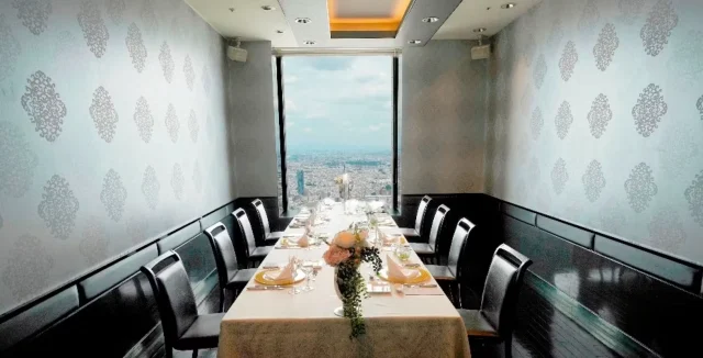 【個室確約 大人数のお祝いディナープラン】モダンフレンチ特別コース+飲み放題付き★3時間利用可★映像機器使用無料★最大60名様可★晴れやかなお祝いに最適な池袋・サンシャインシティ58階の天空レストラン