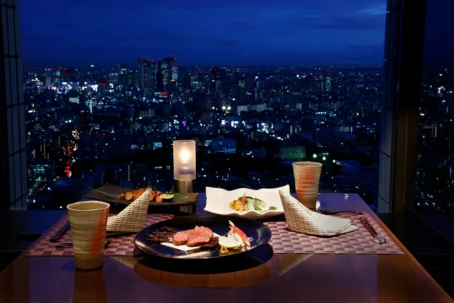 池袋サンシャインシティ 59階、地上220mの天空で、斬新な懐石料理を楽しめる「天空の庭 星のなる木」。「天空」「光」「風」「大地」を表現した和モダンなデザインの店内からは、富士山や新宿の高層ビル群を一望できます。
