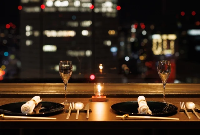 北新地の夜景を独り占めできる「夜景×鉄板焼 和牛 焔 ~HOMURA~」。梅田の街を一望する33階の最上階で、A5ランクの和牛や活きた伊勢海老、あわびなど、目の前で焼き上げられる贅沢な鉄板焼きをご堪能いただけます。窓際のカップルシートや夜景が見える個室席は、記念日や大切な方との特別なひとときにぴったり。アクセスの良さとラグジュアリーな雰囲気が、非日常の時間を演出します。
