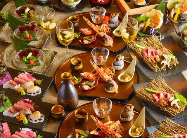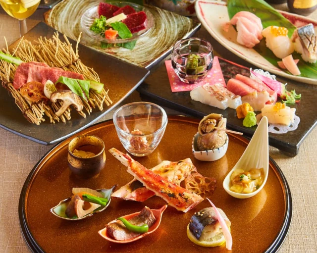 【最大40名×大人数のお祝いディナー】あわび含む豪華八寸や仙台牛、鮮魚盛り、鮭いくら飯含む贅を尽くした全7品コース【虹六】+地酒・生ビール含む2.5時間飲み放題★JR仙台駅徒歩3分の和モダン空間でハレの日を祝福