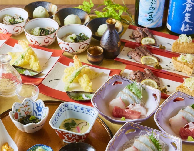 【最大40名×大人数のお祝いディナー】仙台市場直送の鮮魚刺し身盛りや焼き魚&季節の天ぷらなど旬食材を堪能する全7品コース【六鮮】+生ビール含む2時間飲み放題★JR仙台駅すぐ!モダンな和空間で主役をお祝い