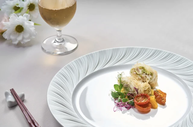 シェフが厳選した地元食材を中心に、彩り豊かなコース料理をご用意。熟練の技が光る一皿一皿は、お祝いの席や特別なディナーにもふさわしい華やかさです。