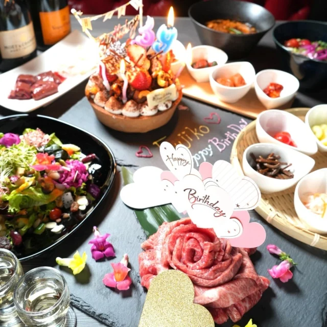 デート誕生日結婚記念日・記念日女子会メッセージプレート付きサプライズ夫婦にぴったり乾杯ドリンク付きお祝いアイテム追加可メッセージカード追加可ケーキ付き個室お子様OK焼肉飲み放題付き花束選択可
