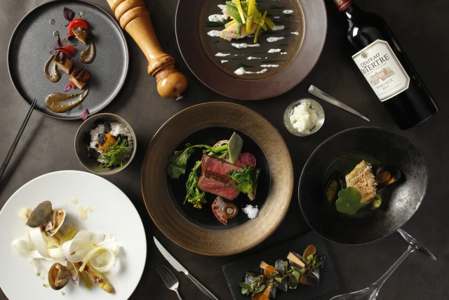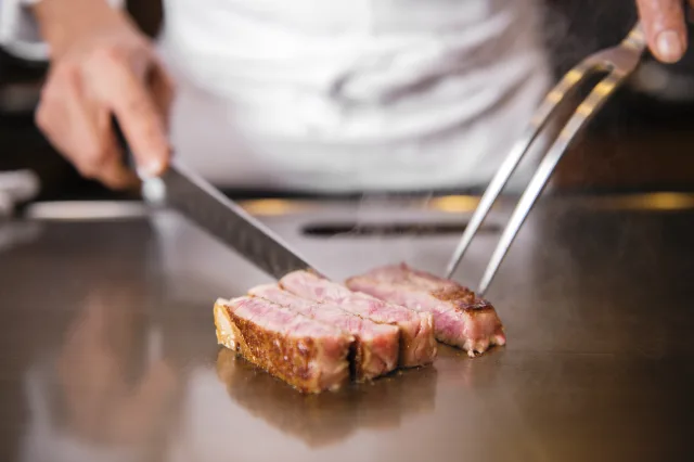 熟練の職人が丁寧に焼き上げる鉄板焼きは、新鮮な素材の美味しさをストレートにお楽しみいただける逸品。中でも、瀬戸内のオリーブを食べて育った上質な牛肉を絶妙な火加減で焼き上げた”氷温熟成「オリーブ牛」サーロインステーキ”は、珠玉の一皿です。お料理に合う厳選ワインも取りそろえております。