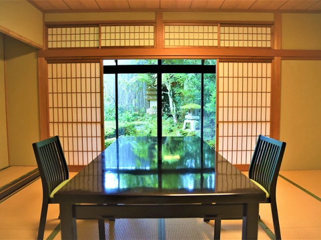 和の趣あふれる玄関をくぐり個室へとご案内、お部屋からは四季折々の庭園風景をご覧いただけます。